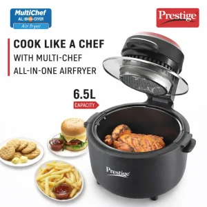 Prestige Multi-Chef All-in-One Air Fryer with 80% less oil consumption for healthier meals. Features 6.5L capacity, 1200W power, digital display, and see-through lid. Perfect for air fry, bake, grill, toast & roast.