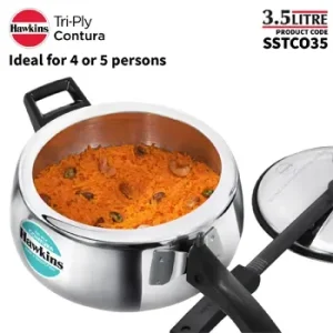 Hawkins Contura Triply Stainless Steel Pressure Cooker (3.5L) with safe inner lid design for efficient cooking. Made with advanced triply construction and suitable for gas stove & induction cooktop—ideal for daily Indian cooking.