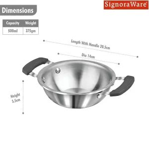 Cook small portions effortlessly with the Signoraware Artista Tri-Ply Mini Kadhai 12cm (500ml). Made with premium tri-ply stainless steel, it delivers even heat distribution and is gas & induction friendly, perfect for tadka, sabzi, frying, sautéing, and quick meals.