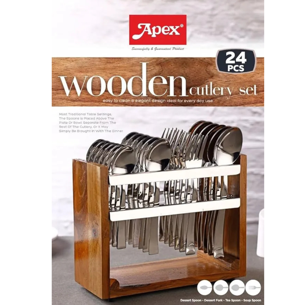 Apex Wooden Cutlery Set 24 Pcs features premium stainless steel spoons, forks and knives with elegant wooden handles. Durable, stylish and perfect for daily dining, dinner tables, parties and gifting.