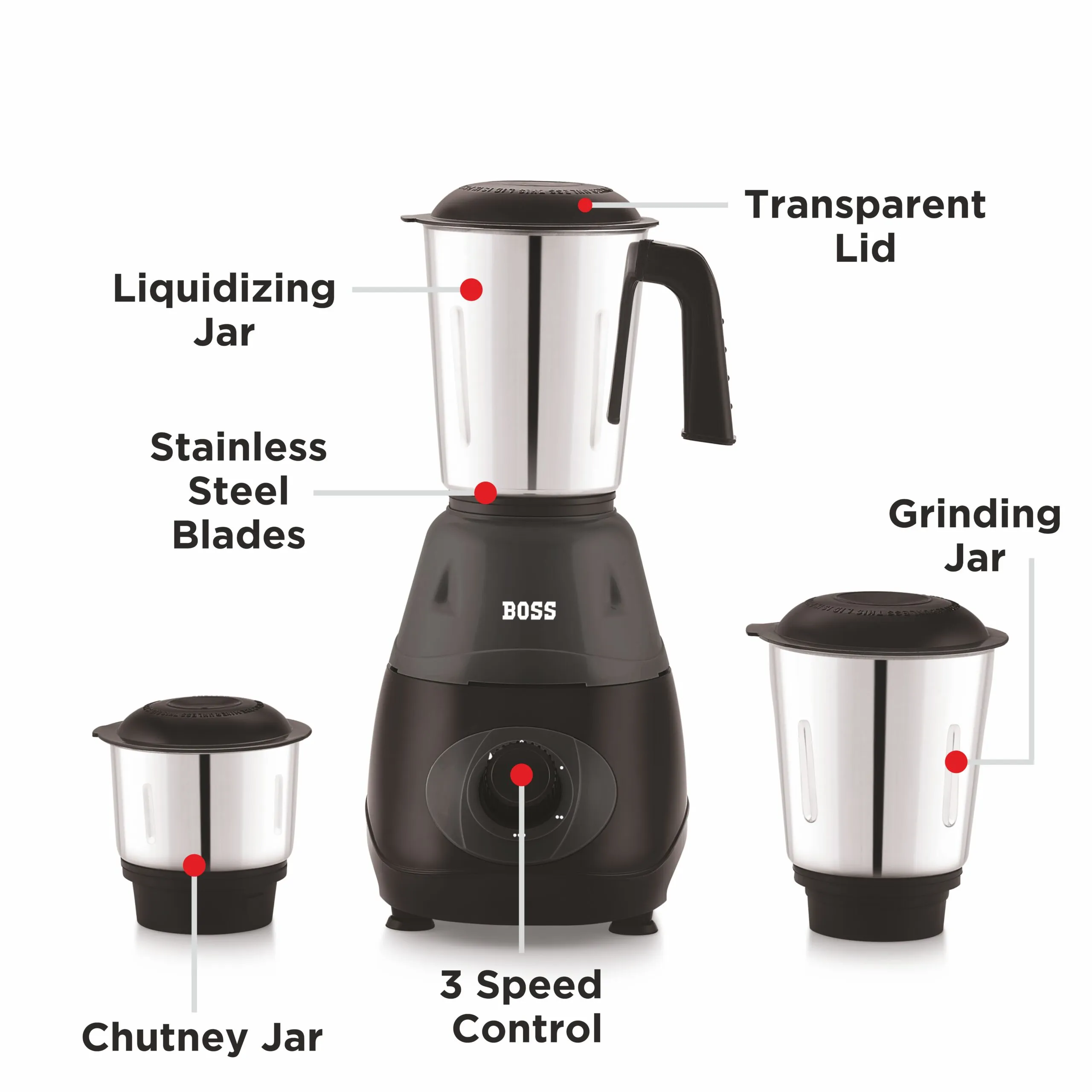 BOSS B274 Bravo 500W Mixer Grinder with Powerful Motor, 3 Stainless Steel Jars, 2 years warranty On Motor