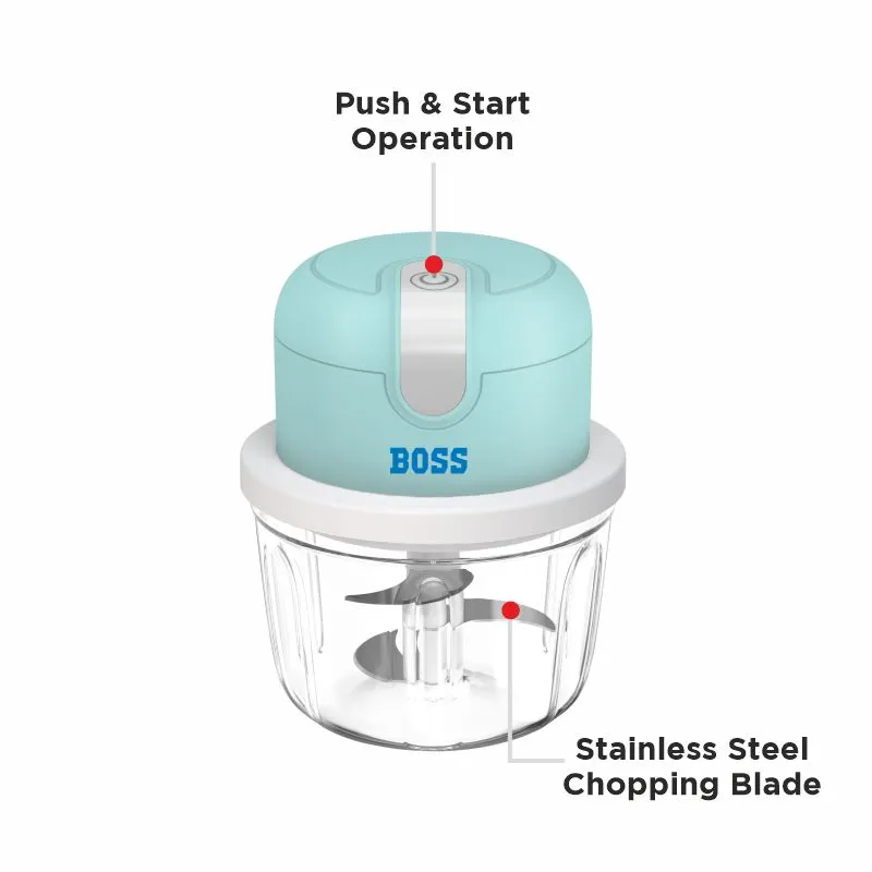 The BOSS B710 Rechargeable USB Mini Chopper features a 350ml capacity, sharp stainless steel blades, and a powerful rechargeable motor for quick chopping. With cordless convenience and USB charging, it is perfect for onions, garlic, nuts, vegetables, and more. Compact, portable, and easy to clean—ideal for everyday kitchen use.