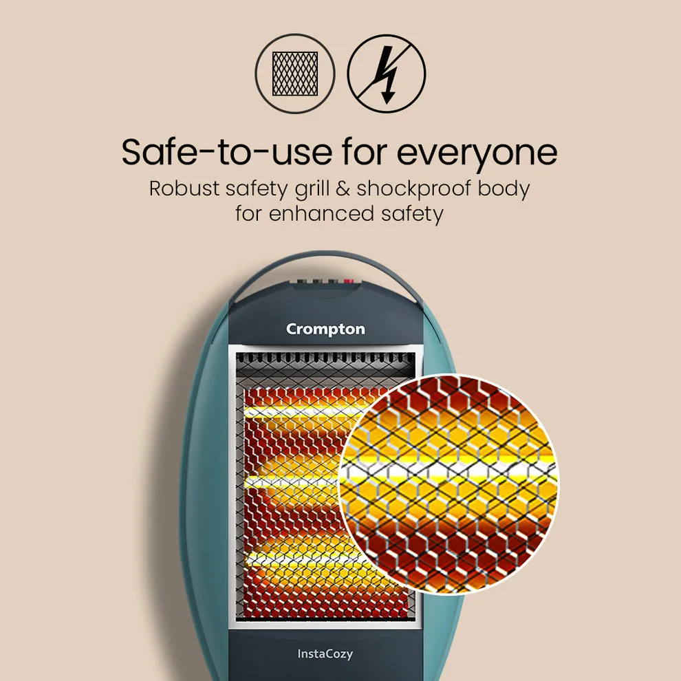 Crompton Insta Cozy 1200W Halogen Room Heater delivers quick, efficient heating with 3 heat settings, tip-over safety, and energy-saving halogen technology.