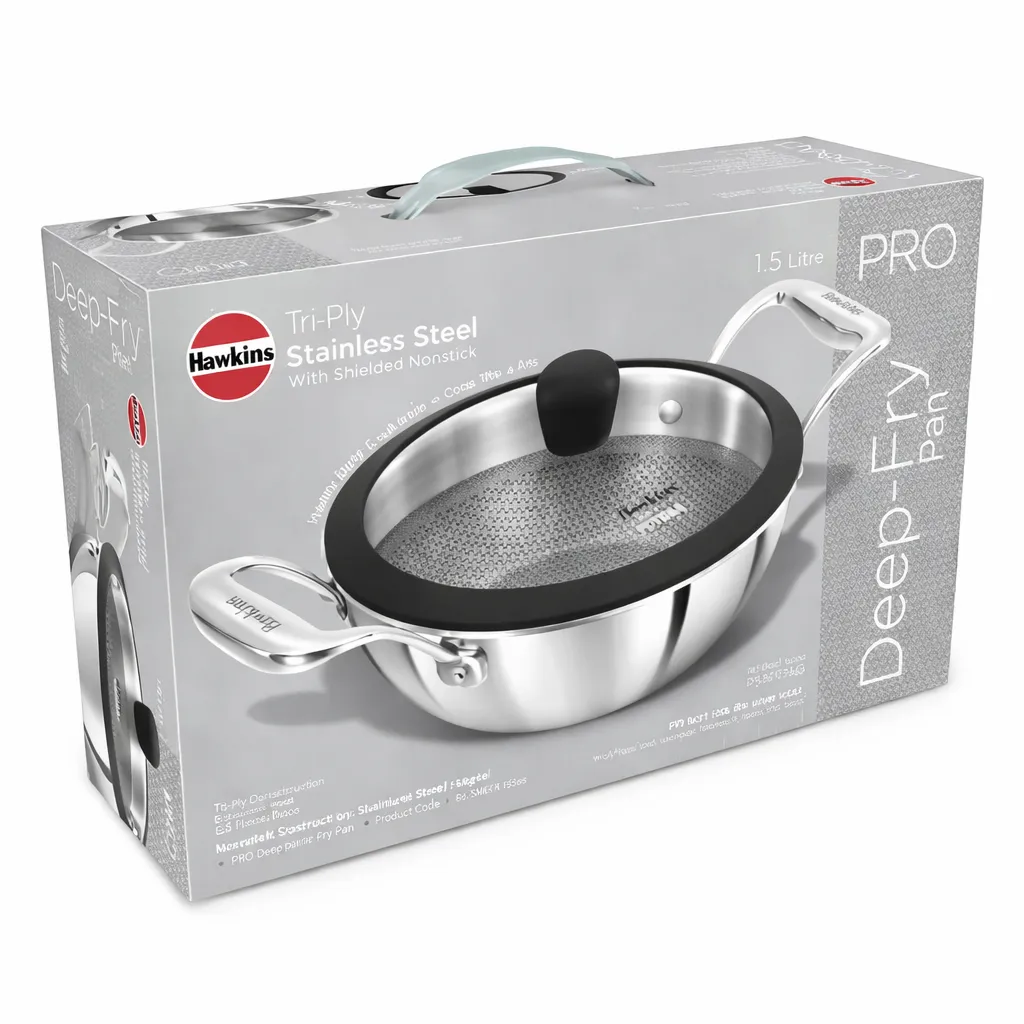 The Hawkins SS Tri-Ply Shielded PRO Deep-Fry Pan 1.5L (PSNK15G) with glass lid offers even heating, induction compatibility, and durable stainless steel performance for everyday Indian cooking.