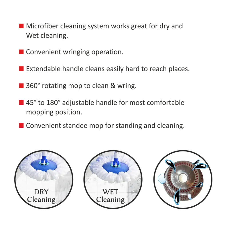 Make cleaning effortless with the Kleeno Super Clean Spin Mop with Steel Jali. Designed with a 360° rotating mop head, durable steel wringer, and an extra refill for extended use—perfect for spotless, hands-free cleaning on all types of floors.