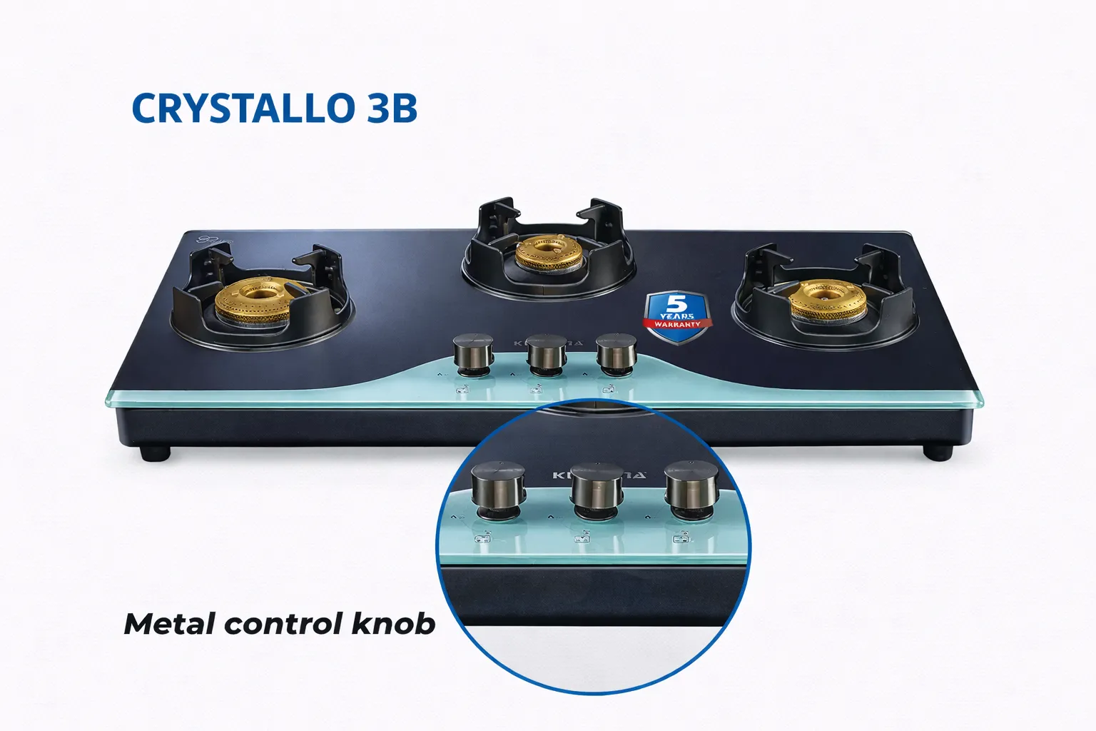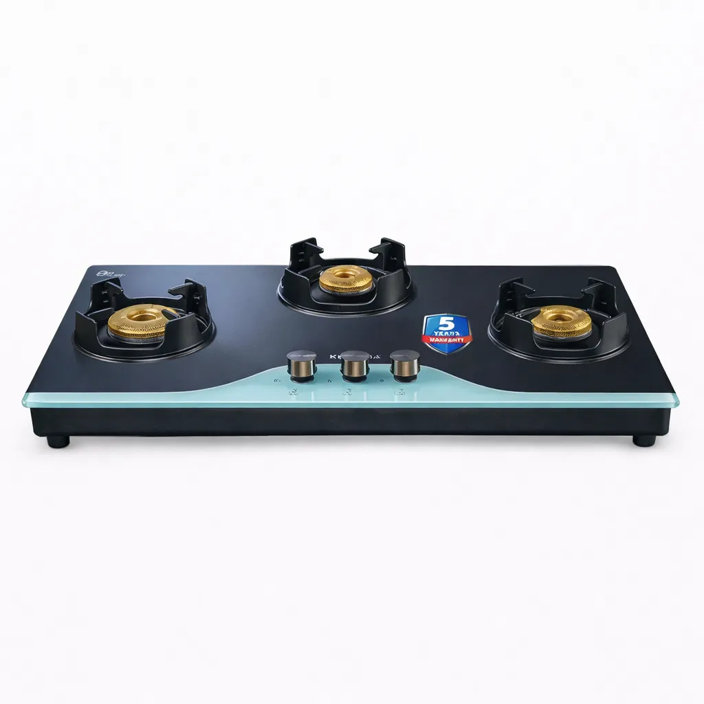 The Kutchina Crystallo 3 Burner Gas Stove features 8mm toughened glass, efficient brass burners, smooth auto ignition and a durable MS body—perfect for modern kitchens.