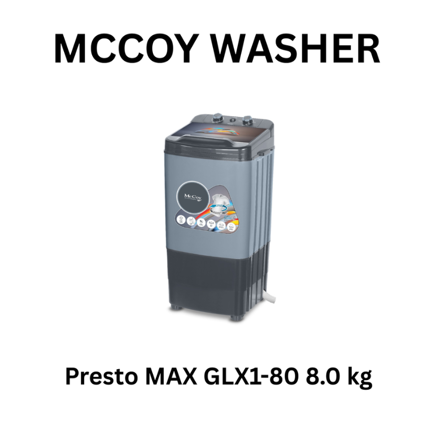 Discover unmatched washing convenience with the MCCOY Presto Max GLX 8.0Kg Washer, designed to handle heavy laundry loads with excellent cleaning performance. Featuring a high-efficiency wash motor, it provides strong water turbulence and deep cleaning to remove tough dirt without damaging fabrics. The spacious 8kg capacity makes it ideal for medium to large families, allowing more clothes to be washed in a single cycle.
