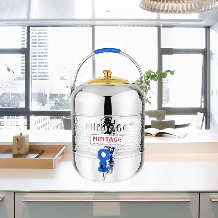 The Mintage Stainless Steel Hammered Matka 25 No. (23L) combines a premium hammered finish, durable stainless steel construction, and a smooth-flow tap—offering hygienic and large-capacity water storage for home, office, and events.