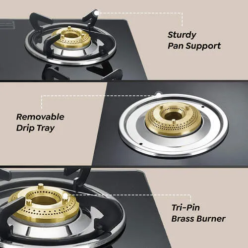 It comes equipped with four high-efficiency brass burners that ensure even flame distribution and faster cooking, allowing you to prepare multiple dishes simultaneously. The ergonomic knobs provide smooth and precise control over the flame, while the spill-proof design makes cleaning effortless after every meal.