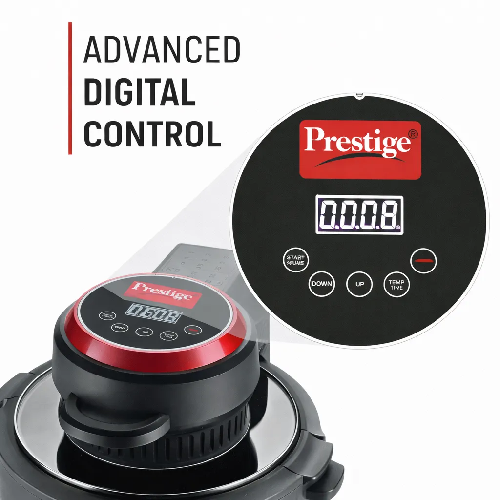 Prestige Multi-Chef All-in-One Air Fryer with 80% less oil consumption for healthier meals. Features 6.5L capacity, 1200W power, digital display, and see-through lid. Perfect for air fry, bake, grill, toast & roast.