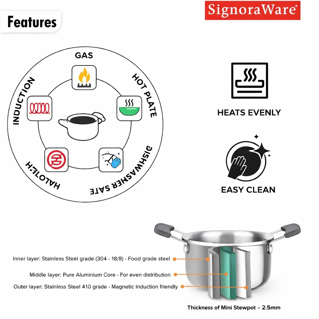 Upgrade your daily cooking with the Signoraware Artista Tri-Ply Mini Stew Pot (10cm, 500ml). Crafted with tri-ply stainless steel construction, this compact stew pot ensures even heat distribution, faster cooking, and long-lasting performance. Ideal for small portions, sauces, soups, boiling milk, and reheating food.