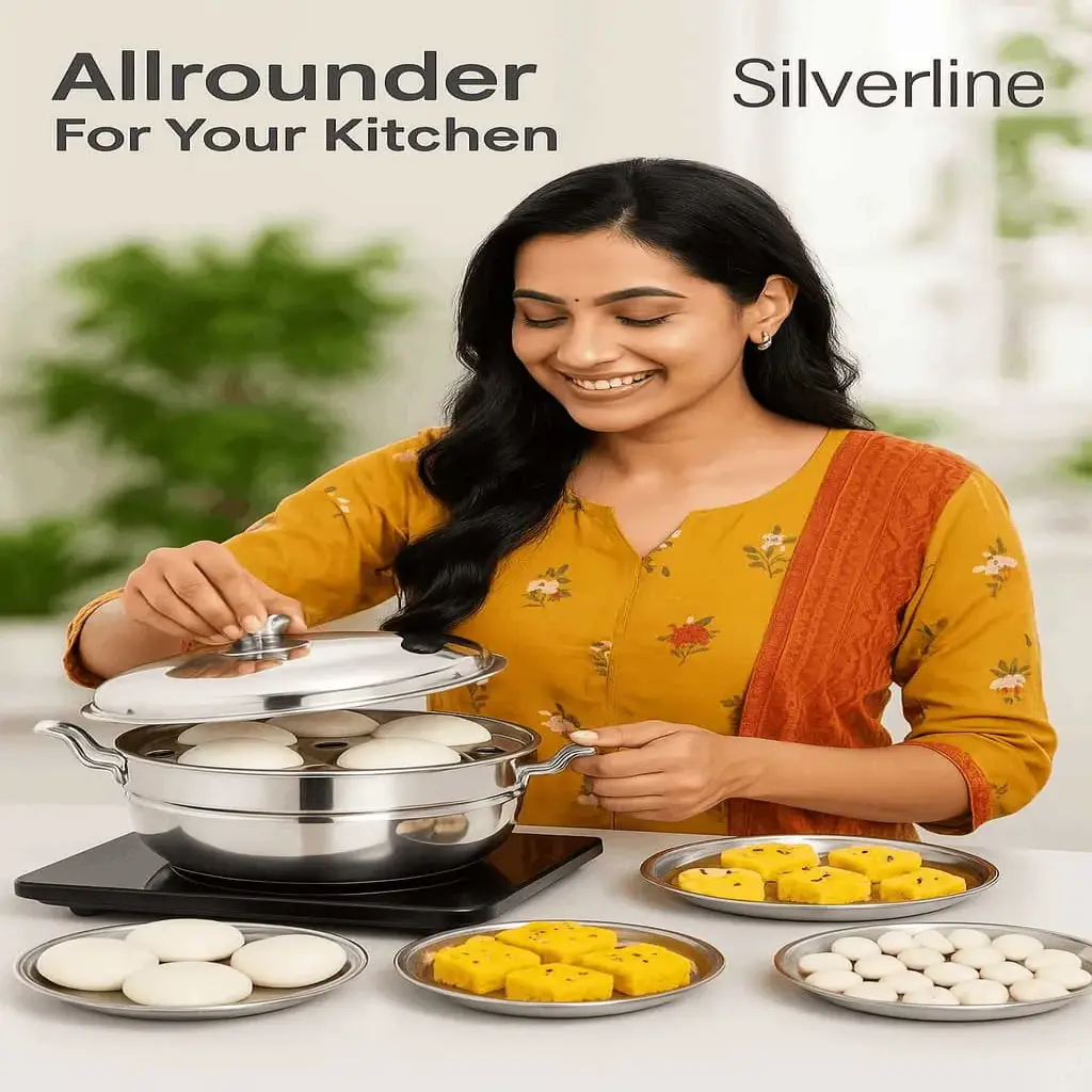 Cook your favorite dishes the healthy way with the Silverline Stainless Steel Multikadai 3-in-1 Combo. This induction-friendly cookware lets you prepare idlis, dhoklas, momos, patra, and steamed delicacies with ease. Made from high-quality stainless steel, it ensures even heating, durability, and a stylish mirror finish — perfect for every modern kitchen.