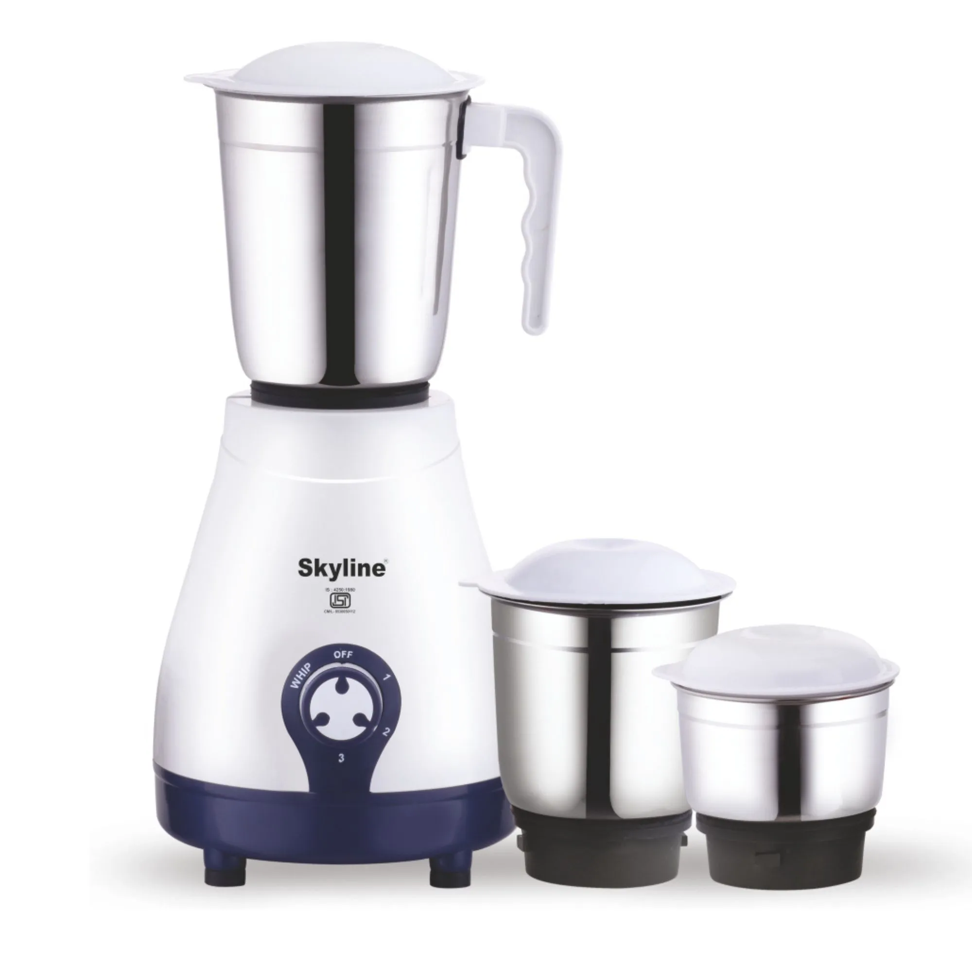 The Skyline VTL-4400 is a high-performance 600 W mixer grinder designed for everyday kitchen use. It features three versatile jars (liquidising, chutney, and dry/wet grinding) with stainless steel blades, a shock-proof ABS body for safety and durability, and secure lid locks for stable operation. Ideal for home kitchens handling everything from smoothies to spice grinding.