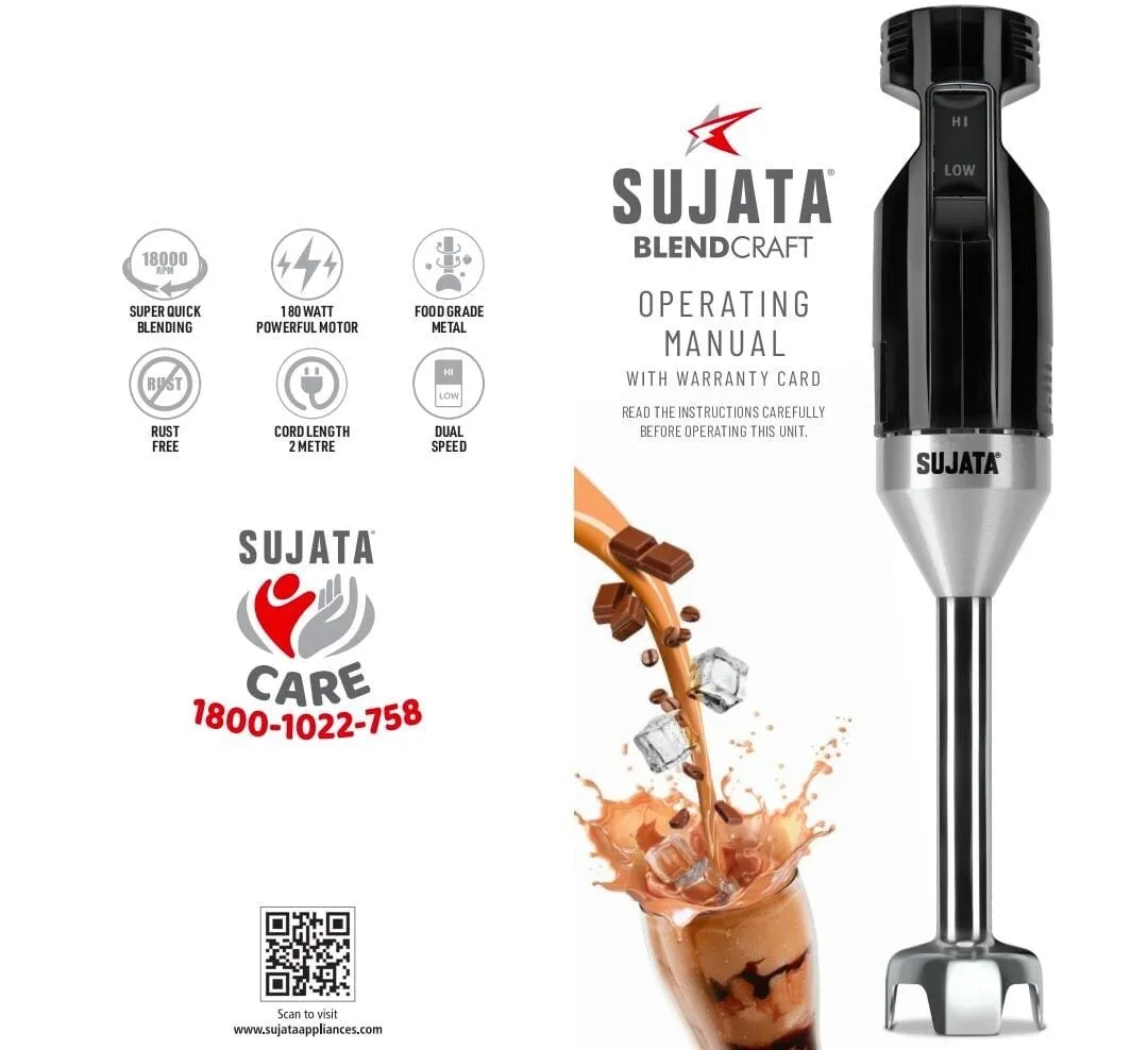Sujata Blendcraft Premium Hand Blender 180W | Powerful Motor | Stainless Steel Blades | Easy Mixing & Blending
